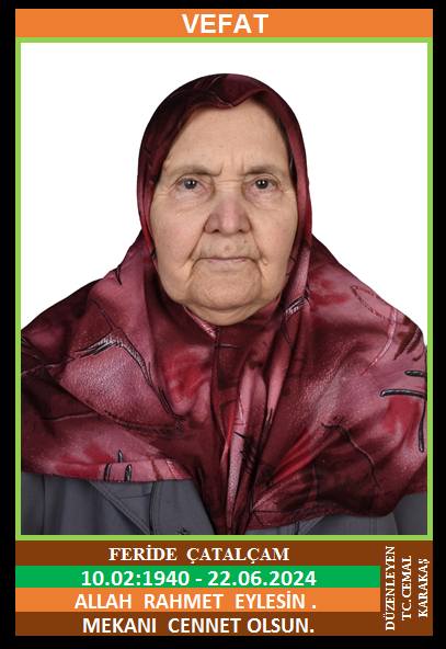 İLÇEMİZ YENİKÖY NÜFUSUNA KAYITLI OLUP, KALAYCILAR MAHALLESİ İ. MEHMET BEŞEVLİ CADDESİ NO:81 C-5’DE İKAMET EDEN MERHUM EYÜP ve MERHUME HANİFE KIZI , MERHUM ŞEVKİ ÇATALÇAM EŞİ, FERİDE ÇATALÇAM (10.02.1940 DOĞUMLU) HAKKIN RAHMETİNE KAVUŞMUŞTUR. CENAZESİ (22.06.2024 CUMARTESİ GÜNÜ) KALAYCILAR MAHALLESİ MERKEZ CAMİİNDE İKİNDİ NAMAZINA MÜTEAKİP KILINACAK CENAZE NAMAZINDAN SONRA SON YOLCULUĞUNA UĞURLANACAKTIR. EŞİ MERHUM ŞEVKİ ÇATALÇAM, ÇOCUKLARI VEYSEL ÇATALÇAM, FATİME BAKIRCIK, AYŞE AÇMALI, SONGÜL CEYLAN, DAMATLARI HASAN BAKIRCIK, RIZA AÇMALI, ALİ CEYLAN. ALLAH RAHMET EYLESİN. MEKANI CENNET OLSUN. GERİDE BIRAKTIĞI SEVENLERİNE VE AİLESİNE BAŞSAĞLIĞI VE SABIR DİLERİZ.