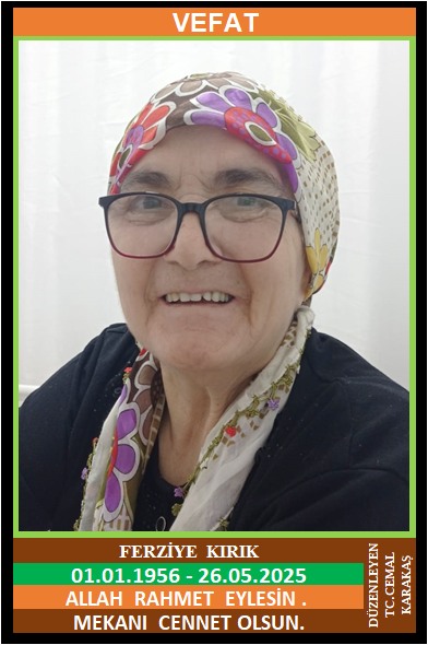 İLÇEMİZ KARŞIYAKA MAHALLESİ NÜFUSUNA KAYITLI OLUP, KARŞIYAKA MAHALLESİ ÇAMLIK KÜME EVLERİ NO: 14/A’DA İKAMET EDEN MERHUM HALİL İBRAHİM KIRIK ve MERHUME HURİYE KIZI, HALİL KIRIK EŞİ, FERZİYE KIRIK (01.01.1956 DOĞUMLU) HAKKIN RAHMETİNE KAVUŞMUŞTUR. CENAZESİ (26.05.2025 PAZARTESİ GÜNÜ) YENİCE MERKEZ CAMİİNDE ÖĞLE NAMAZINA MÜTEAKİP KILINACAK CENAZE NAMAZINDAN SONRA SON YOLCULUĞUNA UĞURLANACAKTIR. EŞİ HALİL KIRIK, ÇOCUKLARI ŞAFAK KIRIK, ŞEFİK KIRIK, SEÇKİN KIRIK. ALLAH RAHMET EYLESİN. MEKANI CENNET OLSUN. GERİDE BIRAKTIĞI SEVENLERİNE VE AİLESİNE BAŞSAĞLIĞI VE SABIR DİLERİZ.