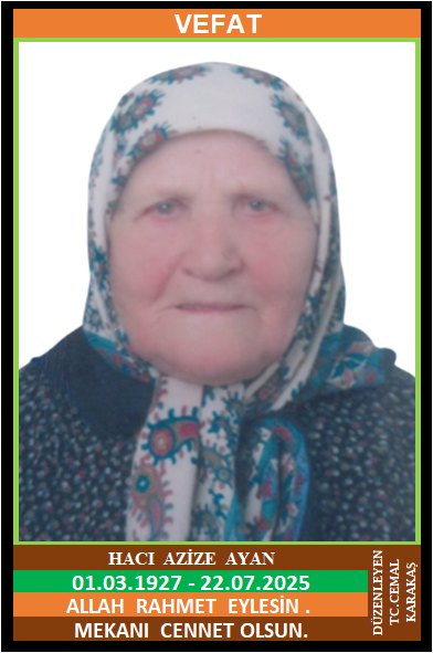 İLÇEMİZ IBRICAK KÖYÜ AYANLAR MAHALLESİ NÜFUSUNA KAYITLI OLUP, IBRICAK KÖYÜ MERKEZ KÜME EVLERİ NO:96’DA İKAMET EDEN MERHUM HALİL ve MERHUME SULTAN KIZI, MERHUM POLİS DURSUN AYAN EŞİ, HACI AZİZE AYAN (01.03.1927 DOĞUMLU) HAKKIN RAHMETİNE KAVUŞMUŞTUR. CENAZESİ (23.07.2025 ÇARŞAMBA GÜNÜ) IBRICAK KÖYÜ KUZULUK CAMİİNDE ÖĞLE NAMAZINA MÜTEAKİP KILINACAK CENAZE NAMAZINDAN SONRA SON YOLCULUĞUNA UĞURLANACAKTIR. EŞİ MERHUM POLİS MEMURU DURSUN AYAN, ÇOCUKLARI MERHUM KEMAL AYAN, IBIRCAK ŞARK KÖŞESİ SAHİBİ KENAN AYAN, NAİM AYAN, GÜLSÜN ERGEZEN, FERAHNAZ İBİK, GELİNLERİ HANİFE AYAN, ERMAN AYAN, HATİCE AYAN, DAMATLARI MUZAFFER ERGEZEN, MUHARREM İBİK. ALLAH RAHMET EYLESİN. MEKANI CENNET OLSUN. GERİDE BIRAKTIĞI SEVENLERİNE VE AİLESİNE BAŞSAĞLIĞI VE SABIR DİLERİZ.