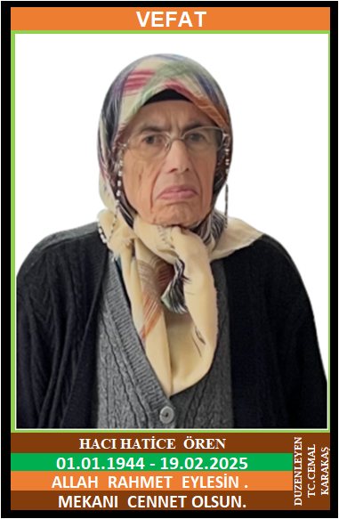 İLÇEMİZ ATATÜRK MAHALLESİ NÜFUSUNA KAYITLI OLUP, ATATÜRK MAHALLESİ ÇINARLI SOKAK NO:10/2’DE İKAMET EDEN MERHUM AHMET ve MERHUME FATMA KIZI, KARABÜK DEMİR ÇELİK EMEKLİSİ MERHUM ZÜHTÜ ÖREN EŞİ, HACI HATİCE ÖREN (01.01.1944 DOĞUMLU) HAKKIN RAHMETİNE KAVUŞMUŞTUR. CENAZESİ (19.02.2025 ÇARŞAMBA GÜNÜ) ATATÜRK MAHALLESİ MERKEZ CAMİİNDE ÖĞLE NAMAZINA MÜTEAKİP KILINACAK CENAZE NAMAZINDAN SONRA SON YOLCULUĞUNA UĞURLANACAKTIR. EŞİ MERHUM ZÜHTÜ ÖREN, ÇOCUKLARI SİNAN ÖREN, EMİN ÖREN, AYNUR CEBECİ, NEJLA ÇAYLI, YASEMİN ÇAYLI, DAMATLARI KENAN CEBECİ, CEVAT ÇAYLI, ABDURRAHMAN ÇAYLI, KARDEŞLERİ MERHUME İRFANİYE TOM, SIDIKA KIRIK, MERHUM HİDAYET MISIRLI, HASAN MISIRLI, AHMET MISIRLI. ALLAH RAHMET EYLESİN. MEKANI CENNET OLSUN. GERİDE BIRAKTIĞI SEVENLERİNE VE AİLESİNE BAŞSAĞLIĞI VE SABIR DİLERİZ.