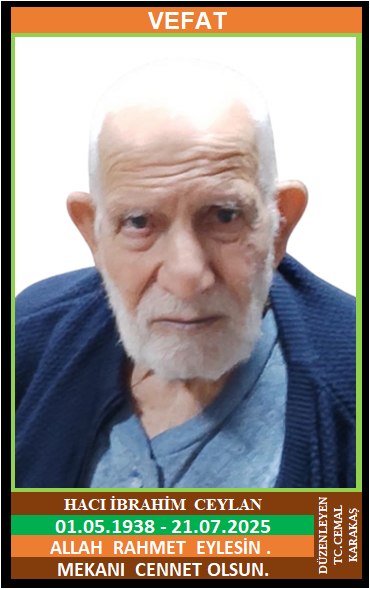 İLÇEMİZ ŞENKÖY KÖYÜ NÜFUSUNA KAYITLI OLUP, ŞENKÖY KÖYÜ MERKEZ KÜME EVLERİ NO:41/A’DA İKAMET EDEN MERHUM MEHMET ve MERHUME ZEYNEP OĞLU, HATİCE CEYLAN EŞİ, TORUN AMCA OLARAK BİLİNEN HACI İBRAHİM CEYLAN (01.05.1938 DOĞUMLU) HAKKIN RAHMETİNE KAVUŞMUŞTUR. CENAZESİ (21.07.2025 PAZARTESİ GÜNÜ) ŞENKÖY KÖYÜ MERKEZ CAMİİNDE ÖĞLE NAMAZINA MÜTEAKİP KILINACAK CENAZE NAMAZINDAN SONRA SON YOLCULUĞUNA UĞURLANACAKTIR. EŞİ HATİCE CEYLAN, ÇOCUKLARI İSMAİL CEYLAN, MEHMET CEYLAN, MEVLÜT CEYLAN, MERHUM ALİ CEYLAN, SIDIKA CEYLAN, KEZBAN DAĞLI, MERHUME EMİNE KIRAÇ, DAMATLARI ALİ DAĞLI, MERHUM ZEKİ KIRAÇ. ALLAH RAHMET EYLESİN. MEKANI CENNET OLSUN. GERİDE BIRAKTIĞI SEVENLERİNE VE AİLESİNE BAŞSAĞLIĞI VE SABIR DİLERİZ.