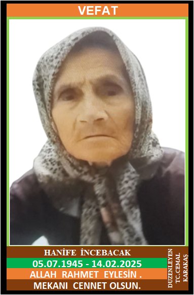 İLÇEMİZ YAZIKÖY İNCEBACAKLAR MAHALLESİ NÜFUSUNA KAYITLI OLUP, YAZIKÖY İNCEBACAKLAR KÜME EVLERİ NO: 13’DE İKAMET EDEN MERHUM SADIK ve MERHUME FATİME KIZI, MUSTAFA İNCEBACAK EŞİ, HANİFE İNCEBACAK (05.07.1945 DOĞUMLU) HAKKIN RAHMETİNE KAVUŞMUŞTUR. CENAZESİ (14.02.2025 CUMA GÜNÜ) YENİCE MERKEZ CAMİİNDE CUMA NAMAZINA MÜTEAKİP KILINACAK CENAZE NAMAZINDAN SONRA SON YOLCULUĞUNA UĞURLANACAKTIR. EŞİ MUSTAFA İNCEBACAK, ÇOCUKLARI ERSAN İNCEBACAK, ERKAN İNCEBACAK, ERHAN İNCEBACAK, KARDEŞLERİ MUSTAFA İNCEBACAK, SADIK İNCEBACAK, RECEP İNCEBACAK, KAMİL İNCEBACAK, FATMA AYAN. ALLAH RAHMET EYLESİN. MEKANI CENNET OLSUN. GERİDE BIRAKTIĞI SEVENLERİNE VE AİLESİNE BAŞSAĞLIĞI VE SABIR DİLERİZ.