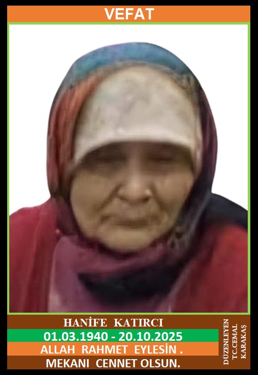 İLÇEMİZ YORTAN BELDESİ MERKEZ MAHALLE NÜFUSUNA KAYITLI OLUP, FATİH CADDESİ NO:252’DE İKAMET EDEN MERHUM OSMAN ve MERHUME ZEYNEP KIZI, YORTAN BELDESİ ESNAFLARINDAN DURMUŞ KATIRCI’NIN EŞİ, HANİFE KATIRCI (01.03.1940 DOĞUMLU) HAKKIN RAHMETİNE KAVUŞMUŞTUR. CENAZESİ (21.10.2025 SALI GÜNÜ) YORTAN BELDESİ MERKEZ CAMİİNDE ÖĞLE NAMAZINA MÜTEAKİP KILINACAK CENAZE NAMAZINDAN SONRA SON YOLCULUĞUNA UĞURLANACAKTIR. EŞİ DURMUŞ KATIRCI, ÇOCUKLARI İSMAİL KATIRCI, MEHMET KATIRCI, YILMAZ KATIRCI, NECATİ KATIRCI, KADİR KATIRCI, FATMA TÜFEKCİ, KEZBAN TÜKENMEZ, NECLA KATIRCI, ERMAN KATIRCI. ALLAH RAHMET EYLESİN. MEKANI CENNET OLSUN. GERİDE BIRAKTIĞI SEVENLERİNE VE AİLESİNE BAŞSAĞLIĞI VE SABIR DİLERİZ.