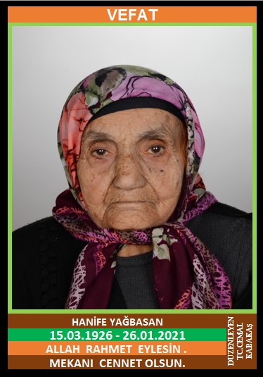 YENİCE IBRICAK KÖYÜ (YENİKÖY) YAĞBASAN MAHALLESİ NÜFUSUNA KAYITLI OLUP, YENİKÖY YAĞBASAN KÜME EVLERİNDE İKAMET EDEN MERHUM HASAN ve MERHUME HATİCE KIZI, HAKKI YAĞBASAN EŞİ, HANİFE YAĞBASAN (15.03.1926 DOĞUMLU) HAKKIN RAHMETİNE KAVUŞMUŞTUR. CENAZESİ (26.01.2021 SALI GÜNÜ) YENİCE IBIRCAK KÖYÜ MERKEZ CAMİİNDE SAAT:14.00’DA KILINACAK CENAZE NAMAZINDAN SONRA SON YOLCULUĞUNA UĞURLANACAKTIR. EŞİ HAKKI YAĞBASAN ÇOCUKLARI HÜSEYİN YAĞBASAN, YUNUS YAĞBASAN, İDRİS YAĞBASAN, MERHUME FATMA BALCI, DAMADI MERHUM KEMAL BALCI. ALLAH RAHMET EYLESİN. MEKANI CENNET OLSUN. GERİDE BIRAKTIĞI SEVENLERİNE VE AİLESİNE BAŞSAĞLIĞI VE SABIR DİLERİZ.