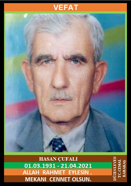YENİCE IBRICAK KÖYÜ NÜFUSUNA KAYITLI OLUP, IBRICAK KÖYÜ MERKEZ KÜME EVLERİ NO: 95’DE İKAMET EDEN MERHUM MUSTAFA ve MERHUME DURKADIN OĞLU, MERHUM DÖNDÜ ÇUFALI EŞİ, HASAN ÇUFALI (01.03.1931 DOĞUMLU) HAKKIN RAHMETİNE KAVUŞMUŞTUR. CENAZESİ (22.04.2021 PERŞEMBE GÜNÜ) YENİCE IBIRCAK KÖYÜ MERKEZ CAMİİNDE SAAT : 11,00’DA KILINACAK CENAZE NAMAZINDAN SONRA SON YOLCULUĞUNA UĞURLANACAKTIR. EŞİ MERHUM DÖNDÜ ÇUFALI, ÇOCUKLARI KEZBAN ÇUFALI, SERPİL ÇUFALI. ALLAH RAHMET EYLESİN. MEKANI CENNET OLSUN. GERİDE BIRAKTIĞI SEVENLERİNE VE AİLESİNE BAŞSAĞLIĞI VE SABIR DİLERİZ.