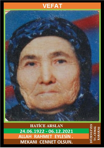 YENİCE GÜNEY KÖYÜ ARSLANLAR MAHALLESİ NÜFUSUNA KAYITLI OLUP, GÜNEY KÖYÜ ARSLANLAR KÜME EVLERİ NO:8’DE İKAMET EDEN MERHUM OSMAN ve MERHUME HATİCE KIZI, MERHUM KUZU LAKABI İLE BİLİNEN İSMAİL ARSLAN EŞİ, HATİCE ARSLAN (24.06.1922 DOĞUMLU) HAKKIN RAHMETİNE KAVUŞMUŞTUR. CENAZESİ (06.12.2021 PAZARTESİ GÜNÜ) YENİCE MERKEZ CAMİİNDE ÖĞLE NAMAZINA MÜTEAKİP KILINACAK CENAZE NAMAZINDAN SONRA SON YOLCULUĞUNA UĞURLANACAKTIR. EŞİ MERHUM İSMAİL ARSLAN, ÇOCUKLARI NECATİ ARSLAN, ŞERAFETTİN ARSLAN, KERAMETTİN ARSLAN, AZİZ ARSLAN, NACİYE EREN, AZİZE EREN, DAMATLARI MERHUM SABRİ EREN, EMEKLİ ZİRAAT BANKASI MEMURU YAŞAR EREN. ALLAH RAHMET EYLESİN. MEKANI CENNET OLSUN. GERİDE BIRAKTIĞI SEVENLERİNE VE AİLESİNE BAŞSAĞLIĞI VE SABIR DİLERİZ.