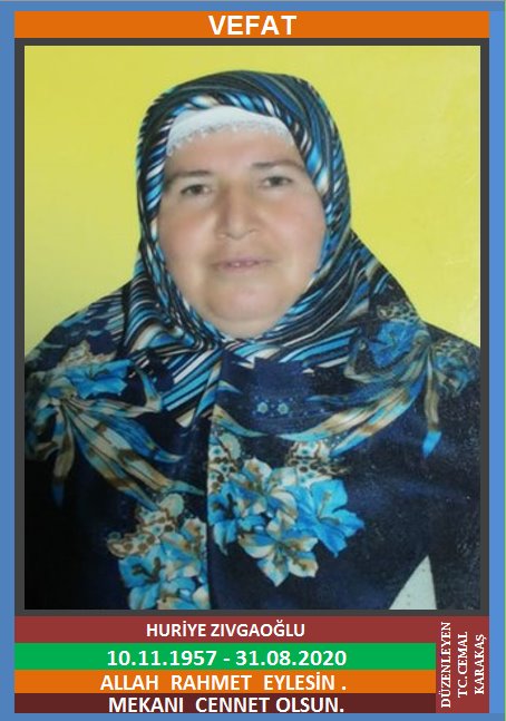 YENİCE ATATÜRK MAHALLESİ HACIMUHAREMLER NÜFUSUNA KAYITLI OLUP, YENİCE KALAYCILAR MAHALLESİ DÜZGÜN SOKAK NO:5/2’DE İKAMET EDEN MERHUM İLYAS ve KEZBAN KIZI, MERHUM ESKİ ŞÖFOR ESNAFLARINDAN MEHMET ZIVGAOĞLU’nun EŞİ, HURİYE ZIVGAOĞLU (10.11.1957 DOĞUMLU) HAKKIN RAHMETİNE KAVUŞMUŞTUR. CENAZESİ (31.08.2020 PAZARTESİ GÜNÜ) KALAYCILAR MAHALLESİ UZUMKUM İSTASYON CAMİİNDE SAAT: 14.00’DA KILINACAK CENAZE NAMAZINDAN SONRA SON YOLCULUĞUNA UĞURLANACAKTIR. EŞİ MERHUM ESKİ ŞÖFOR ESNAFLARINDAN MEHMET ZIVGAOĞLU, ÇOCUKLARI ÖZKAN ZIVGAOĞLU, HAKAN ZIVGAOĞLU, AKIN ZIVGAOĞLU, BARIŞ ZIVGAOĞLU, ZEYNEP ZIVGAOĞLU, KARDEŞİ İLYAS ÇENGEL. ALLAH RAHMET EYLESİN. MEKANI CENNET OLSUN. GERİDE BIRAKTIĞI SEVENLERİNE VE AİLESİNE BAŞSAĞLIĞI VE SABIR DİLERİZ.