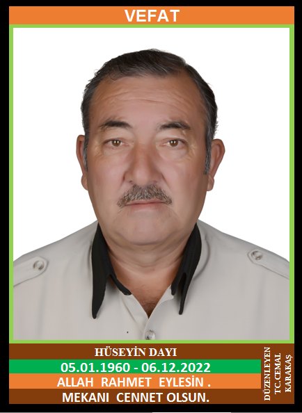 YENİCE ŞİRİNKÖY KÖYÜ ÖMERBAŞI MAHALLESİ NÜFUSUNA KAYITLI OLUP, ŞİRİNKÖY KÖYÜ ÖMERBAŞI KÜME EVLERİ NO:3’DE İKAMET EDEN MERHUM HÜSEYİN ve MERHUME DURKADIN OĞLU, GÜLİSTAN DAYI EŞİ, BOLU-MENGEN-GÖKÇESU MADEN OCAĞI EMEKLİSİ HÜSEYİN DAYI (05.01.1960 DOĞUMLU) HAKKIN RAHMETİNE KAVUŞMUŞTUR. CENAZESİ  (06.12.2022 SALI GÜNÜ) ŞİRİNKÖY KÖYÜ ÖMERBAŞI MAHALLESİ MERKEZ CAMİİNDE ÖĞLE NAMAZINA MÜTEAKİP KILINACAK CENAZE NAMAZINDAN SONRA SON YOLCULUĞUNA UĞURLANACAKTIR. EŞİ GÜLİSTAN DAYI, ÇOCUKLARI ZİYA DAYI, ZAİT DAYI, ELİF DAYI. ALLAH RAHMET EYLESİN. MEKANI CENNET OLSUN. GERİDE BIRAKTIĞI SEVENLERİNE VE AİLESİNE BAŞSAĞLIĞI VE SABIR DİLERİZ.