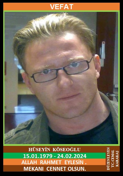 İLÇEMİZ HİSAR KÖYÜ NÜFUSUNA KAYITLI OLUP, ALMANYA’DA İKAMET EDEN MERHUM ARSLAN KÖSEOĞLU ve DÖNDÜ KÖSEOĞLU OĞLU, AYŞE KÖSEOĞLU EŞİ, ŞİNASİ KÖSEOĞLU ve DURDU KÖSEOĞLU’NUN DAMADI, HÜSEYİN KÖSEOĞLU (15.01.1979 DOĞUMLU) HAKKIN RAHMETİNE KAVUŞMUŞTUR. CENAZESİ (29.02.2024 PERŞEMBE GÜNÜ) YENİCE MERKEZ CAMİİNDE ÖĞLE NAMAZINA MÜTEAKİP KILINACAK CENAZE NAMAZINDAN SONRA SON YOLCULUĞUNA UĞURLANACAKTIR. ANNESİ DÖNDÜ KÖSEOĞLU, KAYINBABASI ŞİNASİ KÖSEOĞLU, KAYINVALİDESİ DURDU KÖSEOĞLU, EŞİ AYŞE KÖSEOĞLU, ÇOCUKLARI ERAY KÖSEOĞLU, ARSLAN KÖSEOĞLU, ELANUR KÖSEOĞLU, ECRİN KÖSEOĞLU. ALLAH RAHMET EYLESİN. MEKANI CENNET OLSUN. GERİDE BIRAKTIĞI SEVENLERİNE VE AİLESİNE BAŞSAĞLIĞI VE SABIR DİLERİZ.