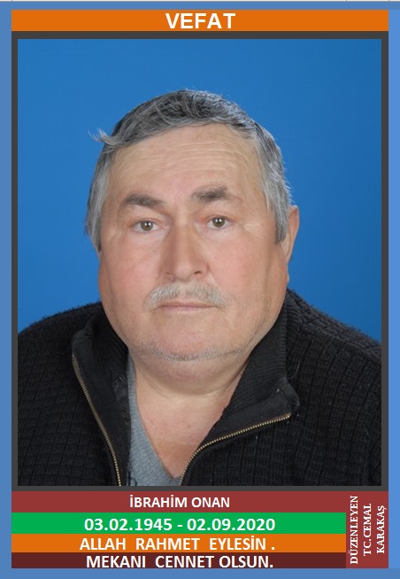 YENİCE GÜNEY (TIR) NÜFUSUNA KAYITLI OLUP, TIR KÖYÜ YENİ KÜME EVLERİ NO:20/3’DE İKAMET EDEN MERHUM ABDULLAH ve HANİFE OĞLU, CEMİLE ONAN EŞİ, İBRAHİM ONAN (03.02.1945 DOĞUMLU) HAKKIN RAHMETİNE KAVUŞMUŞTUR. CENAZESİ  (03.09.2020 PERŞEMBE GÜNÜ) YENİCE MERKEZ  CAMİİNDE SAAT: 10.00 ve AKABİNDE TİR KÖYÜ KADlDEĞİERMENDÜZÜ CAMİİNDE KILINACAK CENAZE NAMAZINDAN SONRA SON YOLCULUĞUNA UĞURLANACAKTIR. EŞİ CEMİLE ONAN ÇOCUKLARI YÜCEL ONAN, BİRCAN ONAN, TÜRKAN ONAN, ERCAN ONAN, ERKAN ONAN, ÖZKAN ONAN, DAMADI HÜSEYİN ONAN, KARDEŞLERİ MERHUM RECEP ONAN, MERHUM TERMAL ONAN, CEMALETTİN ONAN. ALLAH RAHMET EYLESİN. MEKANI CENNET OLSUN. GERİDE BIRAKTIĞI SEVENLERİNE VE AİLESİNE BAŞSAĞLIĞI VE SABIR DİLERİZ.