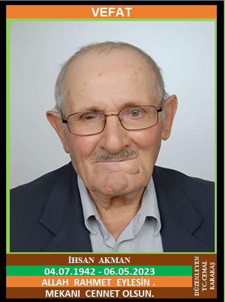 İLÇEMİZ AKMANLAR KÖYÜ KİRAZLAR MAHALLESİ NÜFUSUNA KAYITLI OLUP, AKMANLAR KÖYÜ KİRAZLAR KÜME EVLERİ NO: 18/4’DE İKAMET EDEN MERHUM MUSTAFA ve MERHUME ASİYE OĞLU, MÜNİRE AKMAN EŞİ, UZUN YILLAR AKMANLARDA ESNAFLIK YAPAN GANİOĞLU LAKABI İLE BİLİNEN İHSAN AKMAN (04.07.1942 DOĞUMLU) HAKKIN RAHMETİNE KAVUŞMUŞTUR. CENAZESİ (07.05.2023 PAZAR GÜNÜ) AKMANLAR KÖYÜ MERKEZ CAMİİNDE ÖĞLE NAMAZINA MÜTEAKİP KILINACAK CENAZE NAMAZINDAN SONRA SON YOLCULUĞUNA UĞURLANACAKTIR. EŞİ MÜNİRE AKMAN, ÇOCUKLARI ESAT AKMAN, MEHMET AKMAN, HİKMET AKMAN, İSMET AKMAN, SIDIKA AKMAN, VİLDAN KARAKIRIK, DAMATLARI MURAT AKMAN, TURGUT KARAKIRIK. ALLAH RAHMET EYLESİN. MEKANI CENNET OLSUN. GERİDE BIRAKTIĞI SEVENLERİNE VE AİLESİNE BAŞSAĞLIĞI VE SABIR DİLERİZ.