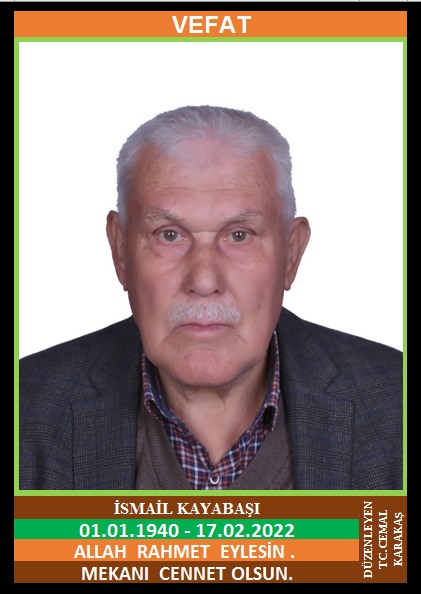 YENİCE ATATÜRK MAHALLESİ NÜFUSUNA KAYITLI OLUP, ATATÜRK MAHALLESİ İSKAN EVLERİ SOKAK NO:22/1’DE İKAMET EDEN MERHUM RIZA ve MERHUME DÖNDÜ OĞLU, NAZMİYE KAYABAŞI EŞİ, İSMAİL KAYABAŞI (01.01.1940 DOĞUMLU) HAKKIN RAHMETİNE KAVUŞMUŞTUR. CENAZESİ (18.02.2022 CUMA GÜNÜ) ATATÜRK MAHALLESİ ÇAY MEVKİ CAMİİNDE CUMA NAMAZINA MÜTEAKİP KILINACAK CENEZE NAMAZINDAN SONRA SON YOLCULUĞUNA UĞURLANACAKTIR. EŞİ NAZMİYE KAYABAŞI,ÇOCUKLARI MERHUME ÖZLEM KAYABAŞI YILMAZ, DAMADI RIDVAN YILMAZ. ALLAH RAHMET EYLESİN. MEKANI CENNET OLSUN. GERİDE BIRAKTIĞI SEVENLERİNE VE AİLESİNE BAŞSAĞLIĞI VE SABIR DİLERİZ.