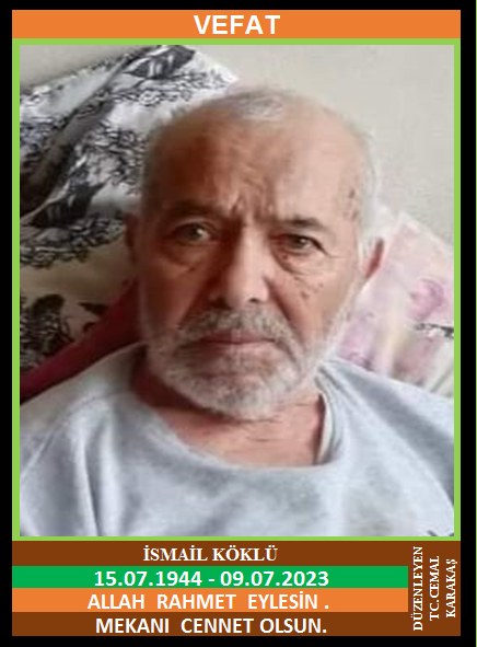 İLÇEMİZ NODULLAR KÖYÜ İYİOĞLU MAHALLESİ NÜFUSUNA KAYITLI OLUP, NODULLAR KÖYÜ İYİOĞLU KÜME EVLERİ NO: 41/A’DA İKAMET EDEN MERHUM MEHMET ve MERHUME HANİFE OĞLU, HANİFE KÖKLÜ EŞİ, YORTAN ESNAFLARINDAN İHSAN KÖKLÜ’NÜN BABASI, İSMAİL KÖKLÜ (15.07.1944 DOĞUMLU) HAKKIN RAHMETİNE KAVUŞMUŞTUR. CENAZESİ (09.07.2023 PAZAR GÜNÜ) YORTAN MERKEZ CAMİİNDE İKİNDİ NAMAZINA MÜTEAKİP KILINACAK CENAZE NAMAZINDAN SONRA SON YOLCULUĞUNA UĞURLANACAKTIR. EŞİ HANİFE KÖKLÜ, ÇOCUKLARI İHSAN KÖKLÜ, HACER KAZANCI, KEZBAN BATAK, SÜMEYYA ÇORAK, DAMATLARI MURAT KAZANCI, KADİR BATAK, HÜSEYİN ÇORAK, KARDEŞLERİ MERHUM İBRAHİM KÖKLÜ, HALİL KÖKLÜ. ALLAH RAHMET EYLESİN. MEKANI CENNET OLSUN. GERİDE BIRAKTIĞI SEVENLERİNE VE AİLESİNE BAŞSAĞLIĞI VE SABIR DİLERİZ.