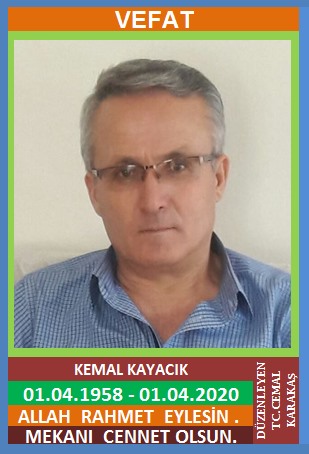 YENİCE ATATÜRK MAHALLESİ NÜFUSUNA KAYITLI OLUP, ZONGULDAK İLİ FİLYOS BELDESİ ve ATATÜRK MAHALLESİ ÇENGELLER KÜME EVLERİ NO: 69/2′ DE İKAMET EDEN MERHUM SAİT ve DURKADIN OĞLU, GÜLCAN KAYACIK EŞİ, ZONGULDAK MADEN TEKNİK ARAMA SİVİL SAVUNMA UZMANI KEMAL KAYACIK (01.04.1958 DOĞUMLU) HAKKIN RAHMETİNE KAVUŞMUŞTUR. CENAZESİ (01.04.2020 ÇARŞAMBA GÜNÜ) ATATÜRK MAHALLESİ’NDE KILINACAK CENAZE NAMAZINA MÜTEAKİP AİLE MEZARLIĞINA DEFNEDİLEREK SON YOLCULUĞUNA UĞURLANACAKTIR. EŞİ GÜLCAN KAYCIK, ÇOCUKLARI MURAT KAYACIK, GÜLBİN ÇELİK, DAMADI ONUR ÇELİK, KARDEŞLERİ MERHUM MUZAFFER KAYACIK, CELAL KAYACIK, NACİYE DEREBAŞI, FATMA ASAR. ALLAH RAHMET EYLESİN. MEKANI CENNET OLSUN. GERİDE BIRAKTIĞI SEVENLERİNE VE AİLESİNE BAŞSAĞLIĞI VE SABIR DİLERİZ.KEMAL KAYACIK