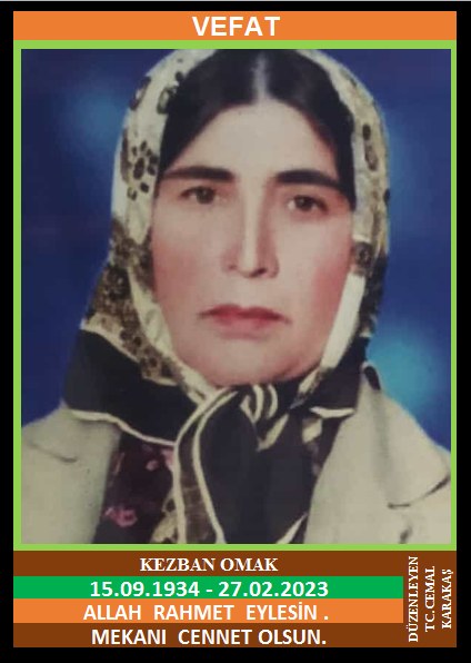 İLÇEMİZ GÜNEY KÖYÜ NÜFUSUNA KAYITLI OLUP, TIR KÖYÜ YENİ KÜME EVLERİ NO:65’DE İKAMET EDEN MERHUM OSMAN ve MERHUME HATİC KIZI, MERHUM DEMİR LAKABI İLE BİLİNEN MUSA OMAK EŞİ, KEZBAN OMAK (15.09.1934 DOĞUMLU) HAKKIN RAHMETİNE KAVUŞMUŞTUR. CENAZESİ (28.02.2023 SALI GÜNÜ) YENİCE MERKEZ CAMİİNDE ÖĞLE NAMAZINA MÜTEAKİP KILINACAK CENAZE NAMAZINDAN SONRA SON YOLCULUĞUNA UĞURLANACAKTIR. EŞİ MERHUM MUSA OMAK, ÇOCUKLARI HARUN OMAK, KAYHAN OMAK, ERHAN OMAK, MÜRVET ARSLAN, AYNUR ARSLAN, PAKİZE ÖZGÜN, SAADET BAYIR, DAMATLARI AHMET ARSLAN, KERAMETTİN ARSLAN, DURSUN ÖZGÜN, ERBİL BAYIR. ALLAH RAHMET EYLESİN. MEKANI CENNET OLSUN. GERİDE BIRAKTIĞI SEVENLERİNE VE AİLESİNE BAŞSAĞLIĞI VE SABIR DİLERİZ.