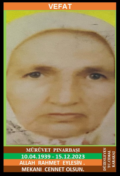 İLÇEMİZ HÜSEYİNBEYOĞLU KÖYÜ NÜFUSUNA KAYITLI OLUP, MERKEZ MAHALLE KANUNİ SOKAK NO:2/2’DE İKAMET EDEN MERHUM KAMİL ve MERHUME PENPE KIZI, MERHUM ATLAN PINARBAŞI EŞİ, YENİCE ESNAFLARINDAN MUHAMMET PINARBAŞI İLE MUTTALİP, EŞREF, HANİFE PINARBAŞI’NIN ANNESİ MÜRÜVET PINARBAŞI (10.04.1939 DOĞUMLU) HAKKIN RAHMETİNE KAVUŞMUŞTUR. CENAZESİ (16.12.2023 CUMARTESİ GÜNÜ) YENİCE YEŞİL CAMİDE ÖĞLE NAMAZINA MÜTEAKİP KILINACAK CENAZE NAMAZINDAN SONRA SON YOLCULUĞUNA UĞURLANACAKTIR. EŞİ MERHUM ATLAN PINARBAŞI, ÇOCUKLARI MUHAMMET, MUTTALİP, EŞREF, HANİFE PINARBAŞI. ALLAH RAHMET EYLESİN. MEKANI CENNET OLSUN. GERİDE BIRAKTIĞI SEVENLERİNE VE AİLESİNE BAŞSAĞLIĞI VE SABIR DİLERİZ.