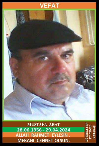 İLÇEMİZ DEREBAŞI KÖYÜ NÜFUSUNA KAYITLI OLUP, KALAYCILAR MAHALLESİ FEVZİ ÇAKMAK CADDESİ NO:37’DE İKAMET EDEN MERHUM ÖMER ve MERHUME HATİCE OĞLU, HANİFE ARAT EŞİ, YENİCE ORÜS EMEKLİSİ MUSTAFA ARAT (28.06.1956 DOĞUMLU) HAKKIN RAHMETİNE KAVUŞMUŞTUR. CENAZESİ (29.04.2024 PAZARTESİ GÜNÜ) KALAYCILAR MAHALLESİ MERKEZ CAMİinDE İKİNDİ NAMAZINA MÜTEAKİP KILINACAK CENAZE NAMAZINDAN SONRA SON YOLCULUĞUNA UĞURLANACAKTIR. EŞİ HANİFE ARAT, ÇOCUKLARI SERCAN ARAT, ERCAN ARAT, BEDİHA TEPEBAŞI, DAMADI METİN TEPEBAŞI, KARDEŞLERİ MERHUM YAŞAR ARAT, SATILMIŞ ARAT, MERHUME FATMA DERELİ, MERHUME HANİFE TEPEBAŞI, MERHUME DÖNDÜ KİRENLİ, MERHUME ŞADİYE KİRENLİ, DURKADIN BALAT. ALLAH RAHMET EYLESİN. MEKANI CENNET OLSUN. GERİDE BIRAKTIĞI SEVENLERİNE VE AİLESİNE BAŞSAĞLIĞI VE SABIR DİLERİZ.