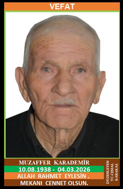 İLÇEMİZ YAMAÇ KÖYÜ YUKARI MAHALLE NÜFUSUNA KAYITLI OLUP, YAMAÇ KÖYÜ YUKARI KÜME EVLERİ NO:70’DE İKAMET EDEN MERHUM HALİT ve MERHUME DUDU OĞLU, MERHUME SATI KARADEMİR EŞİ, MUZAFFER KARADEMİR (10.08.1938 DOĞUMLU) HAKKIN RAHMETİNE KAVUŞMUŞTUR. CENAZESİ (05.03.2026 PERŞEMBE GÜNÜ) YAMAÇ KÖYÜ YUKARI MAHALLE CAMİİNDE ÖĞLE NAMAZINA MÜTEAKİP KILINACAK CENAZE NAMAZINDAN SONRA SON YOLCULUĞUNA UĞURLANACAKTIR. EŞİ MERHUME SATI KARADEMİR, ÇOCUKLARI NİHAT KARADEMİR, MERHUM YÜKSEL KARADEMİR, ŞADİYE ALBAS, FATİME ALBAS, CELAL ALBAS, MEHMET ALBAS, TORUNU UFUK KARADEMİR. ALLAH RAHMET EYLESİN. MEKANI CENNET OLSUN. GERİDE BIRAKTIĞI SEVENLERİNE VE AİLESİNE BAŞSAĞLIĞI VE SABIR DİLERİZ.