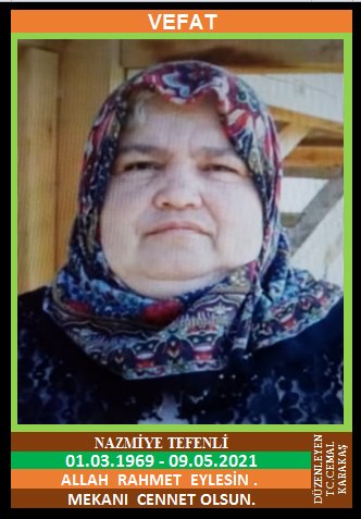YENİCE TIR KÖYÜ NÜFUSUNA KAYITLI OLUP, YENİCE KARŞIYAKA MAHALLESİ ve BOLU İLİ GEREDE İLÇESİ YENİ MAHALLE NECİP FAZIL CADDESİ NO: 6/5’DE İKAMET EDEN VEYİS ve MERHUME DUDU (ZEKİYE) KIZI, PTT EMEKLİSİ ZEKİ TEFENLİ EŞİ, (01.03.1969 DOĞUMLU) HAKKIN RAHMETİNE KAVUŞMUŞTUR. CENAZESİ (09.05.2021 PAZAR GÜNÜ) YENİCE MERKEZ CAMİİNDE İKİNDİ NAMAZI ÖNCESİ SAAT:15.30’DA KILINACAK CENAZE NAMAZI SONRASI SON YOLCULUĞUNA UĞURLANACAKTIR. EŞİ PTT EMEKLİSİ ZEKİ TEFENLİ, ÇOCUKLARI MERHUM OKTAY TEFENLİ, ŞAHİN TEFENLİ. ALLAH RAHMET EYLESİN. MEKANI CENNET OLSUN. GERİDE BIRAKTIĞI SEVENLERİNE VE AİLESİNE BAŞSAĞLIĞI VE SABIR DİLERİZ.