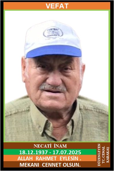 İLÇEMİZ ATATÜRK MAHALLESİ HACI MUHARREMLER SEMTİ NÜFUSUNA KAYITLI OLUP, HACI MUHARREMLER KÜME EVLERİ NO:4/2’DE İKAMET EDEN MERHUM MEHMET ve MERHUME FATİME OĞLU, AZİZE İNAM EŞİ, NECATİ İNAM (18.12.1937 DOĞUMLU) HAKKIN RAHMETİNE KAVUŞMUŞTUR. CENAZESİ  (18.07.2025 CUMA GÜNÜ) YENİCE MERKEZ CAMİİNDE CUMA NAMAZINA MÜTEAKİP KILINACAK CENAZE NAMAZINDAN SONRA SON YOLCULUĞUNA UĞURLANACAKTIR. EŞİ AZİZE İNAM, ÇOCUKLARI CEMAL İNAM, VEDAT İNAM, VİCDAN İNAM, NEVİM İNAM, NEJLA İNAM, KARDEŞLERİ YAŞAR İNAM, HİLMİ İNAM, MERHUME BAHRİYE İNAM, KAYINPEDERİ MERHUM ORMANCI KAZIM ÇAYLI. ALLAH RAHMET EYLESİN. MEKANI CENNET OLSUN. GERİDE BIRAKTIĞI SEVENLERİNE VE AİLESİNE BAŞSAĞLIĞI VE SABIR DİLERİZ.