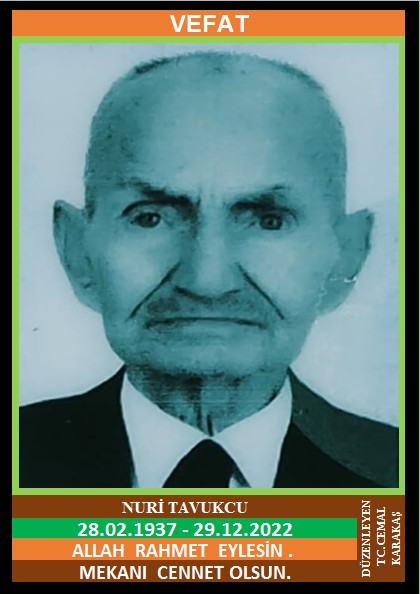 YENİCE ŞENKÖY KÖYÜ MERKEZ MAHALLESİ NÜFUSUNA KAYITLI OLUP, SATUK KÖYÜ BALIKISIK KÜME EVLERİ NO: 12’DE İKAMET EDEN MERHUM MEHMET ve MERHUME HANİFE OĞLU, AZİZE TAVUKCU EŞİ, NURİ TAVUKCU (28.02.1937 DOĞUMLU) HAKKIN RAHMETİNE KAVUŞMUŞTUR. CENAZESİ  (29.12.2022 PERŞEMBE GÜNÜ) ŞENKÖY KÖYÜ MERKEZ CAMİİNDE ÖĞLE NAMAZINA MÜTEAKİP KILINACAK CENAZE NAMAZINDAN SONRA SON YOLCULUĞUNA UĞURLANACAKTIR. EŞİ AZİZE TAVUKCU, ÇOCUKLARI MUHAMMET TAVUKCU, NECMETTİN TAVUKCU, CELAL TAVUKCU, İDRİS TAVUKCU, HATİCE CEYLAN, DAMADI İBRAHİM CEYLAN. ALLAH RAHMET EYLESİN. MEKANI CENNET OLSUN. GERİDE BIRAKTIĞI SEVENLERİNE VE AİLESİNE BAŞSAĞLIĞI VE SABIR DİLERİZ.