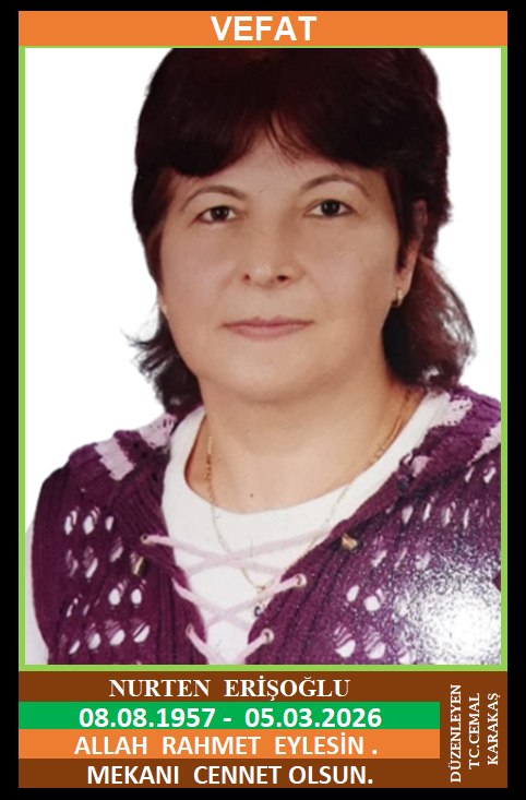 İLÇEMİZ YAMAÇ KÖYÜ NÜFUSUNA KAYITLI OLUP, ZONGULDAK İLİNDE İKAMET EDEN MUSTAFA ÜNLÜTÜRK ve ZUHAL ÜNLÜTÜRK KIZI, MERHUM ŞENOL ERİŞOĞLU EŞİ, NURTEN ERİŞOĞLU (08.08.1957 DOĞUMLU) HAKKIN RAHMETİNE KAVUŞMUŞTUR. CENAZESİ (06.03.2026 CUMA GÜNÜ) YAMAÇ KÖYÜ ORTA MAHALLE CAMİİNDE CUMA NAMAZINA MÜTEAKİP KILINACAK CENAZE NAMAZINDAN SONRA SON YOLCULUĞUNA UĞURLANACAKTIR. EŞİ MERHUM ŞENOL ERİŞOĞLU, ÇOCUKLARI YASEMİN ERİŞOĞLU, NİLÜFER ERİŞOĞLU, AYTAÇ ERİŞOĞLU, YEĞENİ YENİCE BİRLİK ŞOFÖRLERİNDEN ALPER ERİŞOĞLU. ALLAH RAHMET EYLESİN. MEKANI CENNET OLSUN. GERİDE BIRAKTIĞI SEVENLERİNE VE AİLESİNE BAŞSAĞLIĞI VE SABIR DİLERİZ.