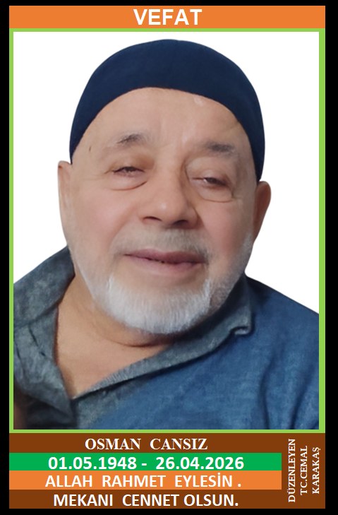 İLÇEMİZ NODULLAR KÖYÜ MERKEZ MAHALLE NÜFUSUNA KAYITLI OLUP, NODULLAR KÖYÜ MERKEZ KÜME EVLERİ NO: 23’DE İKAMET EDEN, MERHUM MUSTAFA ve MERHUME AYŞE OĞLU, OSMAN CANSIZ (01.05.1948 DOĞUMLU) HAKKIN RAHMETİNE KAVUŞMUŞTUR. CENAZESİ (27.04.2026 PAZARTESİ GÜNÜ) YORTAN BELDESİ MERKEZ CAMİİNDE ÖĞLE NAMAZINA MÜTEAKİP KILINACAK CENAZE NAMAZINDAN SONRA SON YOLCULUĞUNA UĞURLANACAKTIR. ALLAH RAHMET EYLESİN. MEKANI CENNET OLSUN. GERİDE BIRAKTIĞI SEVENLERİNE VE AİLESİNE BAŞSAĞLIĞI VE SABIR DİLERİZ.