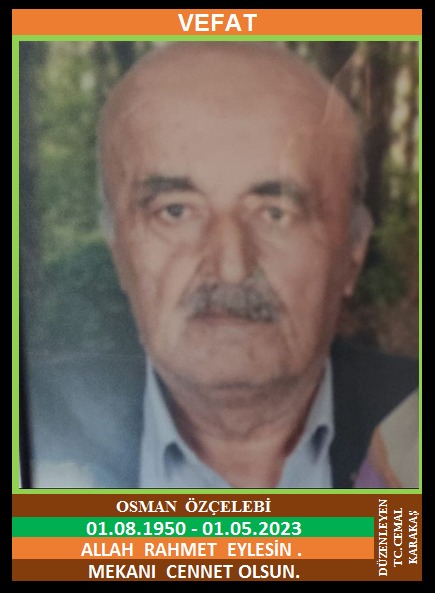 İLÇEMİZ IBRICAK KÖYÜ NÜFUSUNA KAYITLI OLUP, YENİKÖY CUMARYANI KÜME EVLERİ NO:3’DE İKAMET EDEN MERHUM İBRAHİM ve MERHUME HATİCE OĞLU, NEZİHE ÖZÇELEBİ EŞİ, AŞIK OSMAN LAKABI İLE BİLİNEN OSMAN ÖZÇELEBİ (01.08.1950 DOĞUMLU) HAKKIN RAHMETİNE KAVUŞMUŞTUR. CENAZESİ (02.05.2023 SALI GÜNÜ) IBRICAK KÖYÜ MERKEZ CAMİİNDE ÖĞLE NAMAZINA MÜTEAKİP KILINACAK CENAZE NAMAZINDAN SONRA SON YOLCULUĞUNA UĞURLANACAKTIR. EŞİ NEZİHE ÖZÇELEBİ, ÇOCUKLARI SATILMIŞ ÖZÇELEBİ, SELİM ÖZÇELEBİ, SERKAN ÖZÇELEBİ, SEDAT ÖZÇELEBİ, SEHER ÖZÇELEBİ, SONAY ÖZÇELEBİ, SEDA ÖZÇELEBİ. ALLAH RAHMET EYLESİN. MEKANI CENNET OLSUN. GERİDE BIRAKTIĞI SEVENLERİNE VE AİLESİNE BAŞSAĞLIĞI VE SABIR DİLERİZ.