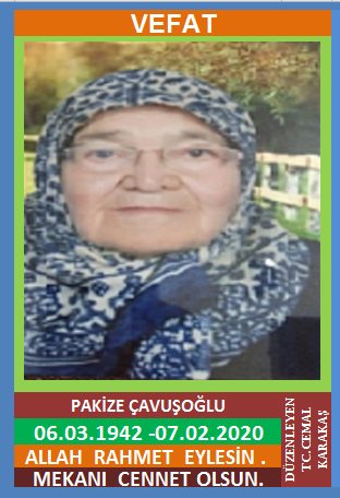 YENİCE MENDERES MAHALLESİ NÜFUSUNA KAYITLI OLUP, YİRMİBEŞLER MAHALLESİ IHLAMUR SOKAK NO:2/3’DE İKAMET EDEN MERHUM İSMAİL ve HURİYE KIZI, MERHUM ALİM ÇAVUŞOĞLU EŞİ, PAKİZE ÇAVUŞOĞLU (06.03.1942 DOĞUMLU) HAKKIN RAHMETİNE KAVUŞMUŞTUR. CENAZESİ (11.02.2020 SALI GÜNÜ) YENİCE MERKEZ CAMİİNDE ÖĞLE NAMAZINA MÜTEAKİP KILINACAK CENAZE NAMAZINDAN SONRA SON YOLCULUĞUNA UĞURLANACAKTIR. EŞİ MERHUM ALİM ÇAVUŞOĞLU, ÇOCUĞU ŞENGÜL ÖRENLİ, DAMADI NİZAMETTİN ÖRENLİ. ALLAH RAHMET EYLESİN. MEKANI CENNET OLSUN. GERİDE BIRAKTIĞI SEVENLERİNE VE AİLESİNE BAŞSAĞLIĞI VE SABIR DİLERİZ.