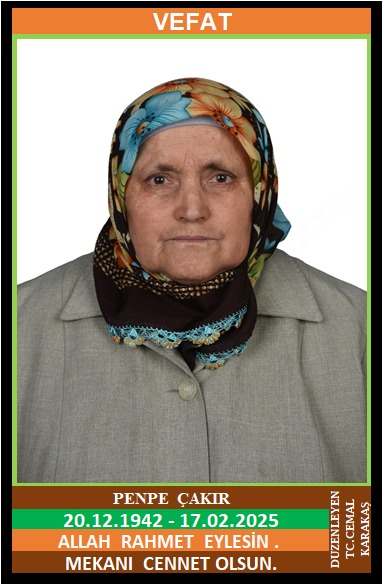 İLÇEMİZ ŞİRİNKÖY ÇÖZLER MAHALLESİ NÜFUSUNA KAYITLI OLUP, ŞİRİNKÖY ÇÖZLER KÜME EVLERİ NO: 6’DA İKAMET EDEN MERHUM SATILMIŞ ve MERHUME KEZBAN KIZI, MERHUM MADEN EMEKLİSİ HASİP OLARAK BİLİNEN YAKUP ÇAKIR EŞİ, S.S. ŞİRİNKÖY TARIMSAL KALKINMA KOOPERATİF BAŞKANI KENAN ÇAKIR İLE MÜNİR ÇAKIR’IN ANNESİ, PENPE ÇAKIR (10.08.1943 DOĞUMLU) HAKKIN RAHMETİNE KAVUŞMUŞTUR. CENAZESİ (18.02.2025 SALI GÜNÜ) ŞİRİNKÖY MERKEZ CAMİİNDE ÖĞLE NAMAZINA MÜTEAKİP KILINACAK CENAZE NAMAZINDAN SONRA SON YOLCULUĞUNA UĞURLANACAKTIR. EŞİ MERHUM MADEN EMEKLİSİ YAKUP ÇAKIR, ÇOCUKLARI KENAN ÇAKIR, MÜNİR ÇAKIR, SEVİM ÇAKIR, ÜMMİYE BOSTANCI, EMİNE ÖZSOY, SEMİHA ÖZSOY, DAMATLARI FEVZİ ÇAKIR, TURAN BOSTANCI, MEHMET ÖZSOY, MUSTAFA ÖZSOY. ALLAH RAHMET EYLESİN. MEKANI CENNET OLSUN. GERİDE BIRAKTIĞI SEVENLERİNE VE AİLESİNE BAŞSAĞLIĞI VE SABIRX DİLERİZ.