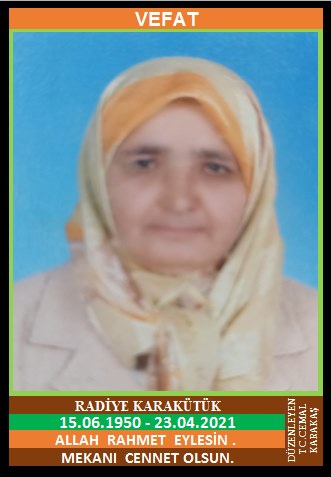 YENİCE YORTAN DÖNGELLER MAHALLESİ NÜFUSUNA KAYITLI OLUP, ZONGULDAK İLİ EREĞLİ İLÇESİ KEPEZ MAHALLESİ PROFÖSÖR MUAMMER AKSOY CADDESİ NO: 114/10’DA İKAMET EDEN MERHUM SATILMIŞ ve MERHUME EMİNE KIZI, MERHUME İSMAİL KARAKÜTÜK EŞİ, RADİYE KARAKÜTÜK (15.06.1950 DOĞUMLU) HAKKIN RAHMETİNE KAVUŞMUŞTUR. CENAZESİ (23.04.2021 CUMA GÜNÜ) YENİCE MERKEZ  CAMİİNDE İKİNDİ NAMAZI SONRASI KILINACAK CENAZE NAMAZINDAN SONRA SON YOLCULUĞUNA UĞURLANACAKTIR. EŞİ MERHUM İSMAİL KARAKÜTÜK, ÇOCUKLARI AHMET KARAKÜTÜK, ALİ KARAKÜTÜK, SALİH KARAKÜTÜK, SATILMIŞ KARAKÜTÜK, HANİFE, HÜLYA, NEJLA, GELİNLERİ NAZMİYE KARATÜTÜK, CEMİLE KARAKÜTÜK, DAMATLARI MUSTAFA, FERRUH, HARUN, KARDEŞİ EMEKLİ ORMAN MUHAFAZA MEMURU DURMUŞ KANCA. ALLAH RAHMET EYLESİN. MEKANI CENNET OLSUN. GERİDE BIRAKTIĞI SEVENLERİNE VE AİLESİNE BAŞSAĞLIĞI VE SABIR DİLERİZ.