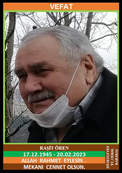 YENİCE ÖRENKÖY KÖYÜ NÜFUSUNA KAYITLI OLUP, ÖREN KÖYÜ MERKEZ KÜME EVLERİ NO:73/2’DE İKAMET EDEN MERHUM KAZIM ve MERHUME FTİME OĞLU, AZİZE ÖREN EŞİ, TTK MADEN EMEKLİSİ RAŞİT ÖREN (17.12.1945 DOĞUMLU) HAKKIN RAHMETİNE KAVUŞMUŞTUR. CENAZESİ (20.02.2023 PAZARTESİ GÜNÜ) ÖRENKÖY MERKEZ CAMİİNDE İKİNDİ NAMAZINA MÜTEAKİP KILINACAK CENAZE NAMAZINDAN SONRA SON YOLCULUĞUNA UĞURLANACAKTIR. EŞİ AZİZE ÖREN, ÇOCUKLARI TUNCAY ÖREN, OLCAY ÖREN, OKTAY ÖREN, HANİFE BEŞEVLİ, DAMADI HÜSEYİN BEŞEVLİ. ALLAH RAHMET EYLESİN. MEKANI CENNET OLSUN. GERİDE BIRAKTIĞI SEVENLERİNE VE AİLESİNE BAŞSAĞLIĞI VE SABIR DİLERİZ.
