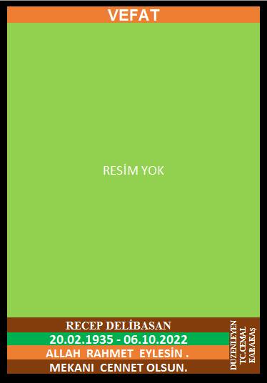 YENİCE ÇAMLIKÖY KÖYÜ MERKEZ MAHALLESİ NÜFUSUNA KAYITLI OLUP,  ÇAMLIKÖY KÖYÜ AŞAĞI KÜME EVLERİ NO:18/2’DE İKAMET EDEN MERHUM İSMAİL ve MERHUME HATİCE OĞLU, MERHUME DUDU DELİBASAN EŞİ, MEHMET ALİ OLARAK BİLİNEN, RECEP DELİBASAN (20.02.1935 DOĞUMLU) HAKKIN RAHMETİNE KAVUŞMUŞTUR. CENAZESİ (06.10.2022 PERŞEMBE GÜNÜ) ÇAMLIKÖY KÖYÜ MERKEZ CAMİİNDE İKİNDİ NAMAZINA MÜTEAKİP KILINACAK CENAZE NAMAZINDAN SONRA SON YOLCULUĞUNA UĞURLANACAKTIR. EŞİ MERHUME DUDU DELİBASAN, ÇOCUKLARI RAHMİ DELİBASAN, MERHUM MEHMET DELİBASAN, SAMİ DELİBASAN, NACİYE ŞENYURT, KEZBAN KÖROĞLU, KADRİYE DELİBASAN, MUHİTTİN ŞENYURT, SAMİ KÖROĞLU. ALLAH RAHMET EYLESİN. MEKANI CENNET OLSUN. GERİDE BIRAKTIĞI SEVENLERİNE VE AİLESİNE BAŞSAĞLIĞI VE SABIR DİLERİZ.