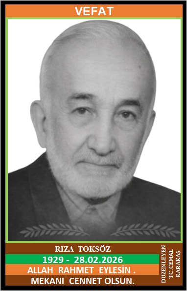 İLÇEMİZ DEREBAŞI KÖYÜ TATARLAR MAHALLESİ NÜFUSUNA KAYITLI OLUP, KARABÜK İLİ ESENTEPE MAHALLESİNDE İKAMET EDEN MERHUM EYÜP ve MERHUME AYŞE OĞLU, ZEYNEP TOKSÖZ EŞİ, KARABÜK DEMİRÇELİK FABRİKASI EMEKLİSİ, ESKİ DEMİRCİ USTASI RIZA TOKSÖZ (1929 DOĞUMLU) HAKKIN RAHMETİNE KAVUŞMUŞTUR. CENAZESİ (28.02.2026 CUMARTESİ GÜNÜ) DEREBAŞI KÖYÜ TATARLAR CAMİİNDE İKİNDİ NAMAZINA MÜTEAKİP KILINACAK CENAZE NAMAZINDAN SONRA SON YOLCULUĞUNA UĞURLANACAKTIR. EŞİ ZEYNEP TOKSÖZ, ÇOCUKLARI EYÜP TOKSÖZ, MUSTAFA TOKSÖZ, HASAN TOKSÖZ, SAFİNAZ OVACIK, FATMA ELİEYİOĞLU, MERHUM AYŞE KIRIK, DAMATLARI MERHUM FAHRİ OVACIK, KEMAL ELİEYİOĞLU, DURSUN KIRIK, KARDEŞLERİ SAMİ TOKSÖZ, MERHUM İSMAİL TOKSÖZ, MERHUME HATİCE AKÇA, MERHUME DURKADIN TOM. ALLAH RAHMET EYLESİN. MEKANI CENNET OLSUN. GERİDE BIRAKTIĞI SEVENLERİNE VE AİLESİNE BAŞSAĞLIĞI VE SABIR DİLERİZ.