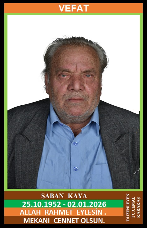 İLÇEMİZ DEĞİRMENYANI KÖYÜ MERKEZ MAHALLE NÜFUSUNA KAYITLI OLUP, DEĞİRMENYANI KÖYÜ MERKEZ KÜME EVLERİ NO:30’DA İKAMET EDEN MERHUM AHMET ve MERHUME FATİME OĞLU, MERHUME FATMA KAYA EŞİ, MADEN EMEKLİSİ ŞABAN KAYA (25.10.1952 DOĞUMLU) HAKKIN RAHMETİNE KAVUŞMUŞTUR. CENAZESİ (03.01.2026 CUMARTESİ GÜNÜ) ŞİRİNKÖY KÖYÜ MERKEZ CAMİİNDE İKİNDİ NAMAZINA MÜTEAKİP  KILINACAK CENAZE NAMAZINDAN SONRA SON YOLCULUĞUNA UĞURLANACAKTIR. EŞİ MERHUME FATMA KAYA, ÇOCUKLARI EROL KAYA, İBRAHİM KAYA, CELAL KAYA, VEDAT KAYA. ALLAH RAHMET EYLESİN. MEKANI CENNET OLSUN. GERİDE BIRAKTIĞI SEVENLERİNE VE AİLESİNE BAŞSAĞLIĞI VE SABIR DİLERİZ.