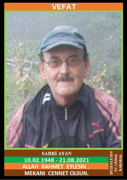YENİCE IBRICAK KÖYÜ NÜFUSUNA KAYITLI OLUP, IBRICAK KÖYÜ MERKEZ KÜME EVLERİ NO:53’DE İKAMET EDEN MERHUM ALİ ZİYA ve MERHUME HATİCE OĞLU, FATİME AYAN EŞİ, IBRICAK ESKİ MUHTARI ŞEMSETTİN AYAN’NIN KARDEŞİ, SABRİ AYAN (10.02.1948 DOĞUMLU) HAKKIN RAHMETİNE KAVUŞMUŞTUR. CENAZESİ (21.08.2021 CUMARTESİ GÜNÜ) IBRICAK KÖYÜ MERKEZ KUZULUK CAMİİNDE ÖĞLE NAMAZINA MÜTEAKİP KILINACAK CENAZE NAMAZINDAN SONRA SON YOLCULUĞUNA UĞURLANACAKTIR. EŞİ FATİME AYAN, ÇOCUKLARI ERDOĞAN AYAN, ERDAL AYAN, MERYEM HOTALAK, ERMAN AYAN, ABİSİ IBRICAK ESKİ MUHTARI ŞEMSETTİN AYAN. ALLAH RAHMET EYLESİN. MEKANI CENNET OLSUN. GERİDE BIRAKTIĞI SEVENLERİNE VE AİLESİNE BAŞSAĞLIĞI VE SABIR DİLERİZ.