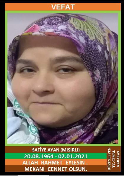 YENİCE IBIRCAK KÖYÜ NÜFUSUNA KAYITLI OLUP, KARABÜK İLİNDE İKAMET EDEN MERHUM ESKİ IBRICAK KÖYÜ MUHTARI HASAN MISIRLI ve MERHUME ZAHİRE KIZI, MEHMET AYAN EŞİ, SAFİYE AYAN (MISIRLI) (20.08.1964 DOĞUMLU) HAKKIN RAHMETİNE KAVUŞMUŞTUR. CENAZESİ (03.01.2021 PAZAR GÜNÜ) YENİCE IBIRCAK KÖYÜ MERKEZ CAMİİNDE SAAT:13.30’DA KILINACAK CENAZE NAMAZINDAN SONRA SON YOLCULUĞUNA UĞURLANACAKTIR. EŞİ MEHMET AYAN, ÇOCUKLARI KASIM AYAN, UĞUR AYAN, SEMİHA AYAN ÇORBACI, DAMADI AZİZ OĞLU ERSİN ÇORBACI. ALLAH RAHMET EYLESİN. MEKANI CENNET OLSUN. GERİDE BIRAKTIĞI SEVENLERİNE VE AİLESİNE BAŞSAĞLIĞI VE SABIRLAR DİLERİZ.