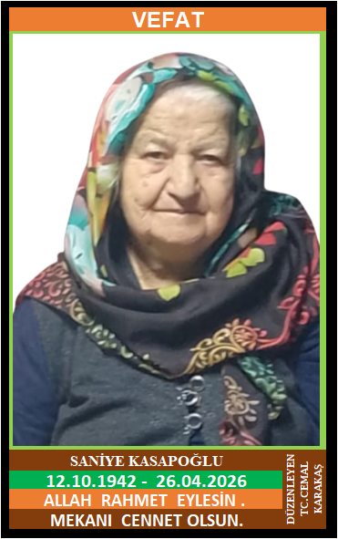 İLÇEMİZ YORTAN BELDESİ ÇENGELLER MAHALLESİ NÜFUSUNA KAYITLI OLUP, ÇENGELLER KÜME EVLERİ NO: 62’DE İKAMET EDEN, MERHUM HAKKI ve MERHUME FATİME KIZI, MEHMET KASAPOĞLU EŞİ, SANİYE KASAPOĞLU (12.10.1942 DOĞUMLU) HAKKIN RAHMETİNE KAVUŞMUŞTUR. CENAZESİ (26.04.2026 PAZAR GÜNÜ) YORTAN BELDESİ MERKEZ CAMİİNDE İKİNDİ NAMAZINA MÜTEAKİP KILINACAK CENAZE NAMAZINDAN SONRA SON YOLCULUĞUNA UĞURLANACAKTIR. EŞİ MEHMET KASAPOĞLU, ÇOCUKLARI MEHMET KASAPOĞLU, NECATİ KASAPOĞLU, CELAL KASAPOĞLU, RAHMMİ KASAPOĞLU, FATMA SUGEÇTİ, AYŞE KARAÇAY, NAZLI OVAZ, KEZBAN ÇATAL, DAMATLARI RAFET SUGEÇTİ, MERHUM CEVAT KARAÇAY, HÜSEYİN OVAZ, METİN ÇATAL. ALLAH RAHMET EYLESİN. MEKANI CENNET OLSUN. GERİDE BIRAKTIĞI SEVENLERİNE VE AİLESİNE BAŞSAĞLIĞI VE SABIR DİLERİZ.