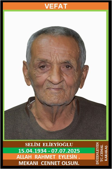 İLÇEMİZ GÜNEY KÖYÜ KAPAN ÇUKURU MAHALLESİ NÜFUSUNA KAYITLI OLUP, KAPAN ÇUKURU KÜME EVLERİ NO:19/B’DE İKAMET EDEN MERHUM EYÜP ve MERHUME KEZBAN OĞLU, MERHUME HANİFE ELİEYİOĞLU EŞİ, SELİM ELİEYİOĞLU (15.04.1934 DOĞUMLU) HAKKIN RAHMETİNE KAVUŞMUŞTUR. CENAZESİ (08.07.2025 SALI GÜNÜ) YENİCE MERKEZ CAMİİNDE ÖĞLE NAMAZINA MÜTEAKİP KILINACAK CENAZE NAMAZINDAN SONRA SON YOLCULUĞUNA UĞURLANACAKTIR. EŞİ MERHUME HANİFE ELİEYİOĞLU, ÇOCUKLARI MERHUM OSMAN ELİEYİOĞLU, MERHUM ORHAN ELİEYİOĞLU, KIZLARI ZELİHA ŞIK, AZİZE MEŞEBAŞI, SIDIKA SAZOĞLU, DAMATLARI KAMİL ŞIK, YÜKSEL MEŞEBAŞI, NİZAMETTİN SAZOĞLU, KARDEŞLERİ MUHARREM ELİEYİOĞLU, MERHUM RIZA ELİEYİOĞLU, MERHUM AHMET ELİEYİOĞLU, MERHUM NAZİF ELİEYİOĞLU, MERHUM MEHMET ELİEYİOĞLU, MERHUME FATİME KOYMATCIK, MERHUME SIDIKA KOCA. ALLAH RAHMET EYLESİN. MEKANI CENNET OLSUN. GERİDE BIRAKTIĞI SEVENLERİNE VE AİLESİNE BAŞSAĞLIĞI VE SABIR DİLERİZ.