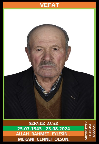 İLÇEMİZ SARAY KÖYÜ NÜFUSUNA KAYITLI OLUP, SARAY KÖYÜ KÖLEMEN KÜME EVLERİ NO:59/1’DE İKAMET EDEN MERHUM NURİ ve MERHUME ZEKİYE OĞLU, RAHİME ACAR EŞİ, SERVER ACAR (25.07.1943 DOĞUMLU) HAKKIN RAHMETİNE KAVUŞMUŞTUR. CENAZESİ (24.08.2024 CUMARTESİ GÜNÜ) SARAY KÖYÜ KÖLEMEN CAMİİNDE ÖĞLE NAMAZI SONRASI KILINACAK CENAZE NAMAZINDAN SONRA SON YOLCULUĞUNA UĞURLANACAKTIR. EŞİ RAHİME ACAR, OĞLU NURİ ACAR, KARDEŞİ İBRAHİM ACAR. ALLAH RAHMET EYLESİN. MEKANI CENNET OLSUN. GERİDE BIRAKTIĞI SEVENLERİNE VE AİLESİNE BAŞSAĞLIĞI VE SABIR DİLERİZ.
