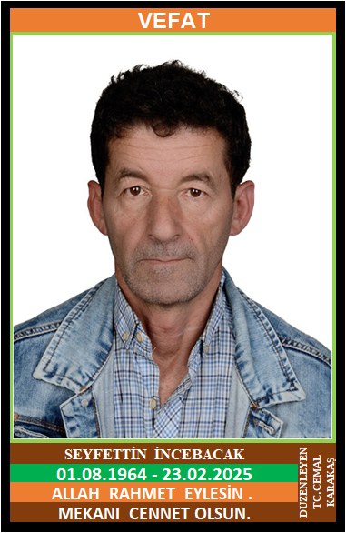 İLÇEMİZ GÖKBEL KÖYÜ HACIÖMERLER MAHALLESİ NÜFUSUNA KAYITLI OLUP, GÖKBEL KÖYÜ HACI ÖMERLER KÜME EVLERİ NO:57/A’DA İKAMET EDEN MERHUM HÜSNÜ ve MERHUME DURKADIN OĞLU, NACİYE İNCEBACAK EŞİ SEYFETTİN İNCEBACAK (01.08.1964 DOĞUMLU) HAKKIN RAHMETİNE KAVUŞMUŞTUR. CENAZESİ (24.02.2025 PAZARTESİ GÜNÜ) GÖKBEL KÖYÜ MERKEZ CAMİİNDE ÖĞLE NAMAZINA MÜTEAKİP KILINACAK CENAZE NAMAZINDAN SONRA SON YOLCULUĞUNA UĞURLANACAKTIR. EŞİ NACİYE İNCEBACAK, ÇOCUKLARI GÜLTEKİN İNCEBACAK, AYTEKİN İNCEBACAK GÜLDANE CEYLAN, DAMADI MEHMET CEYLAN . ALLAH RAHMET EYLESİN. MEKANI CENNET OLSUN. GERİDE BIRAKTIĞI SEVENLERİNE VE AİLESİNE BAŞSAĞLIĞI VE SABIR DİLERİZ.