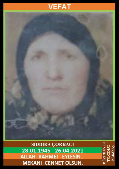 YENİCE IBIRCAK KÖYÜ NÜFUSUNA KAYITLI OLUP, IBRICAK KÖYÜ TABAKLAR MAHALLESİ ve KARABÜK’DE İKAMET EDEN MERHUM ŞAKİR ve MERHUME HATİCE KIZI, MUHARREM ÇORBACI EŞİ, SIDDIKA ÇORBACI (28.01.1945 DOĞUMLU) HAKKIN RAHMETİNE KAVUŞMUŞTUR. CENAZESİ  (26.04.2021 PAZARTESİ GÜNÜ) YENİCE IBRICAK  MERKEZ CAMİİNDE ÖĞLE NAMAZI SONRASI KILINACAK CENAZE NAMAZINDAN SONRA SON YOLCULUĞUNA UĞURLANACAKTIR. EŞİ MUHARREM ÇORBACI, ÇOCUKLARI DURSUN ÇORBACI, HÜSEYİN ÇORBACI, KEZBAN BEZİRCİ, EMİNE SAYILI. ALLAH RAHMET EYLESİN. MEKANI CENNET OLSUN. GERİDE BIRAKTIĞI SEVENLERİNE VE AİLESİNE BAŞSAĞLIĞI VE SABIR DİLERİZ.