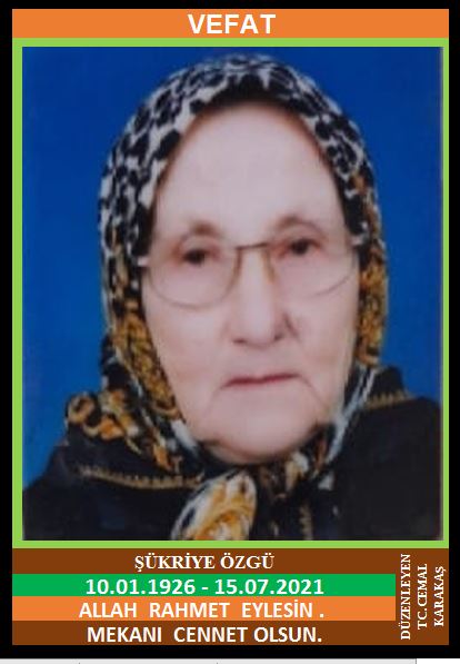 YENİCE HİSAR KÖYÜ NÜFUSUNA KAYITLI OLUP, HİSAR KÖYÜ KÖYİÇİ MEVKİ NO:31/B’DE İKAMET EDEN MERHUM MUSTAFA ve MERHUME CEMİLE KIZI, MERHUM HÜSAMETTİN ÖZGÜ EŞİ, HİSAR KÖYÜ MUHTARIMIZ ERTAN ÖZGÜ’NÜN ANNESİ, ŞÜKRİYE ÖZGÜ (10.01.1926 DOĞUMLU) HAKKIN RAHMETİNE KAVUŞMUŞTUR.CENAZESİ (15.07.2021 PERŞEMBE GÜNÜ) HİSAR KÖYÜ KÖYİÇİ MAHALLESİNDEKİ OKULUN ÖNÜNDE SAAT 14.00’DA KILINACAK CENAZE NAMAZINDAN SONRA SON YOLCULUĞUNA UĞURLANACAKTIR. EŞİ MERHUM HÜSAMETTİN ÖZGÜ ÇOCUKLARI YILDIZ MANKAL, MERHUM GÜNEŞ (LEMAN) NUR, MERHUM GÜRCAN ÖZGÜ, RAHMİ ÖZGÜ, ERTAN ÖZGÜ, DÜNYA (MELİHA) ÖZGÜN, AYŞE DURNA, DAMATLARI MERHUM M. ALİ DEMİR MANKAL, NAHİT NUR, DURMUŞ ÖZGÜN, ALİ HAYDAR DURNA. ALLAH RAHMET EYLESİN. MEKANI CENNET OLSUN. GERİDE BIRAKTIĞI SEVENLERİNE VE AİLESİNE BAŞSAĞLIĞI VE SABIR DİLERİZ.