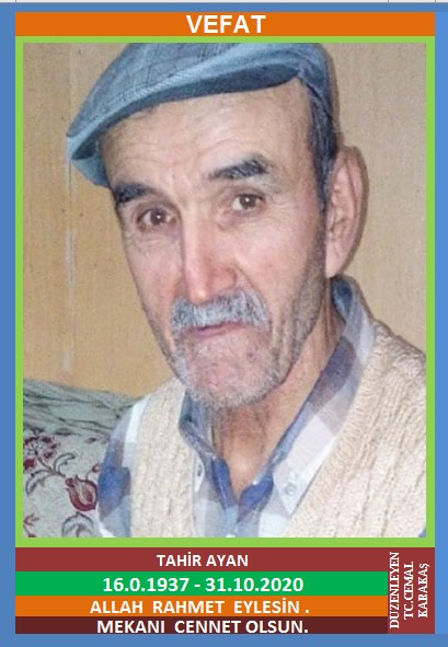 YENİCE YAZIKÖYÜ NÜFUSUNA KAYITLI OLUP, YAZIKÖY AHÇILAR KÜME EVLERİ NO:81’DE İKAMET EDEN MERHUM AHMET ve EMİNE OĞLU, NAZMİYE AYAN EŞİ, KARA TAHİR LAKABIYLA BİLİNEN TAHİR AYAN (16.09.1937 DOĞUMLU) HAKKIN RAHMETİNE KAVUŞMUŞTUR. CENAZESİ (31.10.2020 CUMARTESİ GÜNÜ) YENİCE YAZIKÖY ÇOBANLAR MAHALLESİ CAMİİNDE SAAT: 13.30’DA KILINACAK CENAZE NAMAZINDAN SONRA SON YOLCULUĞUNA UĞURLANACAKTIR. EŞİ NAZMİYE AYAN, ÇOCUKLARI OSMAN AYAN, SAFİYE AYAN, DURSUN AYAN, KARDEŞLERİ ŞEVKİ AYAN, MERHUM HÜSNÜ AYAN, SATİA KALAYCI. ALLAH RAHMET EYLESİN. MEKANI CENNET OLSUN. GERİDE BIRAKTIĞI SEVENLERİNE VE AİLESİNE BAŞSAĞLIĞI VE SABIR DİLERİZ.