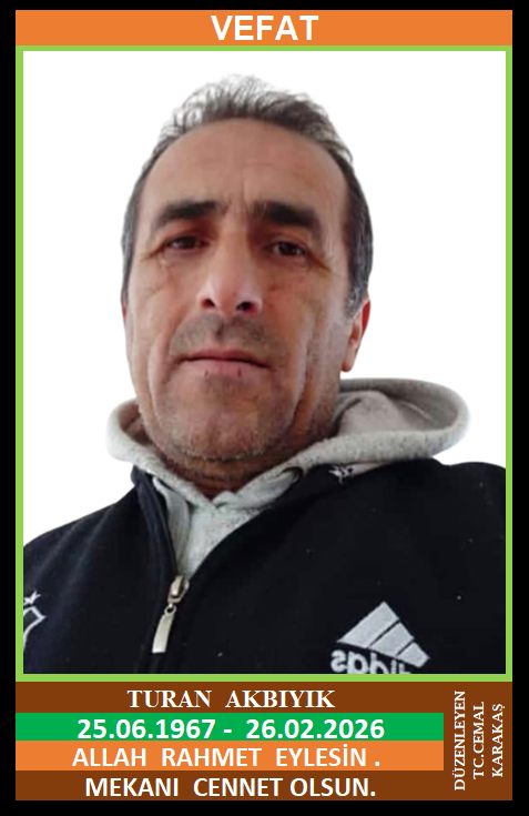 İLÇEMİZ GÜNEY KÖYÜ AKBIYIKLAR MAHALLESİ NÜFUSUNA KAYITLI OLUP, İSTANBUL İLİ ve İSMETPAŞA MAHALLESİ MİMAR SİNAN SOKAK NO:1’DE İKAMET EDEN MUZAFFER ve MERHUME HANİFE, HATİCE OĞLU, ZELVER AKBIYIK EŞİ, ŞOFÖR TURAN AKBIYIK (25.06.1967 DOĞUMLU) HAKKIN RAHMETİNE KAVUŞMUŞTUR. CENAZESİ (27.02.2023 CUMA GÜNÜ) İSMETPAŞA MAHALLESİ MERKEZ CAMİİNDE CUMA NAMAZINA MÜTEAKİP KILINACAK CENAZE NAMAZINDAN SONRA SON YOLCULUĞUNA UĞURLANACAKTIR. BABASI MUZAFFER AKBIYIK, ANNESİ HATİCE AKBIYIK, EŞİ ZELVER AKBIYIK, ÇOCUKLARI FULYA BERNA AKBIYIK …, DENİZ AKBIYIK …, ŞENAY DERYA AKBIYIK …, DAMATLARI SEÇKİN …, EMRAH …, SELÇUK …, KARDEŞLERİ TURGAY AKBIYIK, TUNCAY AKBIYIK, EMRE AKBIYIK, ÜSKÜNAR ODABAŞ, FATİME AKBIYIK, MERVE AKSOY. ALLAH RAHMET EYLESİN. MEKANI CENNET OLSUN. GERİDE BIRAKTIĞI SEVENLERİNE VE AİLESİNE BAŞSAĞLIĞI VE SABIR DİLERİZ.
