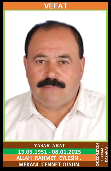 İLÇEMİZ ATATÜRK MAHALLESİ NÜFUSUNA KAYITLI OLUP, ATATÜRK MAHALLESİ ÇENGELLER KÜME EVLERİ NO:19/2’DE İKAMET EDEN MERHUM TEVFİK ve MERHUME HAVVA OĞLU, NACİYE ARAT EŞİ, YAŞAR ARAT (13.05.1951 DOĞUMLU) HAKKIN RAHMETİNE KAVUŞMUŞTUR. CENAZESİ (08.01.2025 ÇARŞAMBA GÜNÜ) ATATÜRK MAHALLESİ MERKEZ CAMİİNDE İKİNDİ NAMAZINA MÜTEAKİP KILINACAK CENAZE NAMAZINDAN SONRA SON YOLCULUĞUNA UĞURLANACAKTIR. EŞİ NACİYE ARAT, ÇOCUKLARI MEHMET ARAT, BÜLENT ARAT, COŞKUN ARAT, AYNUR KİRENLİ, DAMADI KAZIM KİRENLİ, KARDEŞLERİ MERHUM ŞABAN ARAT, MERHUME DURKADIN ARAT, DÖNDÜ BERBER, ZEYNEP ARAT. ALLAH RAHMET EYLESİN. MEKANI CENNET OLSUN. GERİDE BIRAKTIĞI SEVENLERİNE VE AİLESİNE BAŞSAĞLIĞI VE SABIR DİLERİZ.