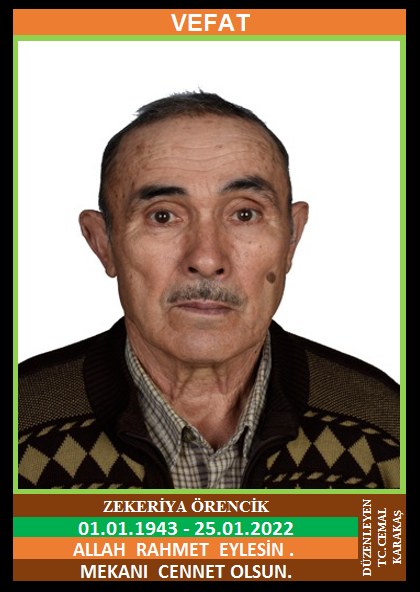 YENİCE ÖRENKÖY NÜFUSUNA KAYITLI OLUP, ÖRENKÖY MERKEZ MEVKİİ NO:62/2’DE İKAMET EDEN MERHUM HASAN ve MERHUME DUDU OĞLU, MERHUME SAFİYE ÖRENCİK EŞİ, ZEKERİYA ÖRENCİK (01.01.1943 DOĞUMLU) HAKKIN RAHMETİNE KAVUŞMUŞTUR. CENAZESİUGÜN (25.01.2022 SALI GÜNÜ) ÖRENKÖY MERKEZ CAMİİNDE ÖĞLE NAMAZINA MÜTEAKİP KILINACAK CENAZE NAMAZINDAN SONRA SON YOLCULUĞUNA UĞURLANACAKTIR. ÇOCUKLARI GÜLCAN YANIK, DURDANE ÖREN, DURDU ONUR, YETER ONUR, ŞÜKRAN ÖREN, DAMATLARI İSMET YANIK, KERİM ÖREN, RAMAZAN ONUR, ERDAL ONUR, TAYFUN ÖREN. ALLAH RAHMET EYLESİN. MEKANI CENNET OLSUN. GERİDE BIRAKTIĞI SEVENLERİNE VE AİLESİNE BAŞSAĞLIĞI VE SABIR DİLERİZ.