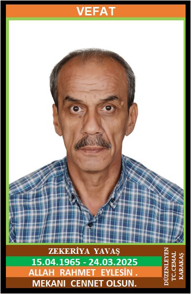İLÇEMİZ YORTAN BELDESİ DÖNGELLER MAHALLESİ NÜFUSUNA KAYITLI OLUP, ATATÜRK MAHALLESİ ZÜBEYDE HANIM BULVARI NO:88/1’DE İKAMET EDEN MERHUM MEHMET ve MERHUME SATİYE OĞLU, SULTAN YAVAŞ EŞİ, ZEKERİYA YAVAŞ (15.04.1965 DOĞUMLU) HAKKIN RAHMETİNE KAVUŞMUŞTUR. CENAZESİ (25.03.2025 SALI GÜNÜ) ATATÜRK MAHALLESİ MERKEZ CAMİİNDE ÖĞLE NAMAZINA MÜTEAKİP KILINACAK CENAZE NAMAZI ve AKABİNDE YORTAN BELDESİ MERKEZ  CAMİİNDE SAAT:14.30’DA KILINACAK CENEZE NAMAZLARINDAN SONRA SON YOLCULUĞUNA UĞURLANACAKTIR. EŞİ SULTAN YAVAŞ, ÇOCUKLARI YASEMİN TATAR, GÜLBAHAR GENÇ, MERVE ONARAN, NERGİS YAVAŞ, DAMATLARI KORAY TATAR, YENİCE AVUKATLARINDAN ADEM GENÇ, ŞABAN ONARAN, KARDEŞLERİ MERHUM İSMAİL YAVAŞ, FATMA AKDÖNGEL, GÜLİSTAN GÖYNÜK, KEZBAN ÇENGEL, YEĞENLERİ ERDAL YAVAŞ, MEHMET YAVAŞ. ALLAH RAHMET EYLESİN. MEKANI CENNET OLSUN. GERİDE BIRAKTIĞI SEVENLERİNE VE AİLESİNE BAŞSAĞLIĞI VE SABIR DİLERİZ.